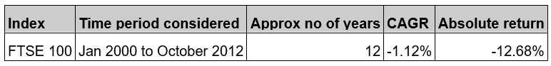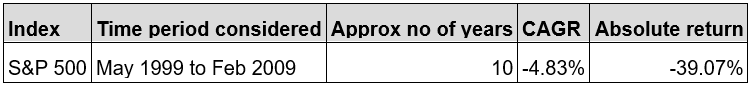 That said, if we take note of certain prolonged down cycles in the S&P 500, we will witness long term trend of losses. For example, from 1999 to 2009, the S&P 500 had given a CAGR of -4.83% and an absolute loss of -39% Please refer to the table below-