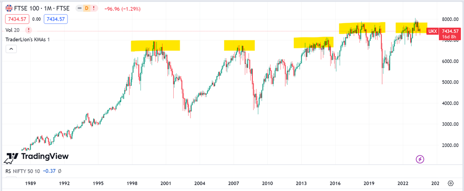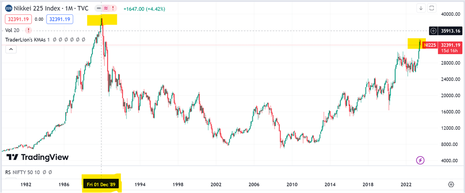 We will notice here that the Index value reached its peak in 1989 and it’s been 34 years since then but the ’89 high has never been crossed.