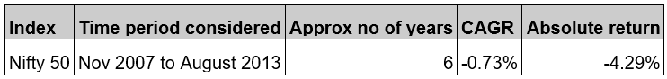 We can see the clear long term uptrend here as well but if we look at the Nifty 50 from 2007 to 2013, the index has given negative returns for 6 years. Details in the table below-