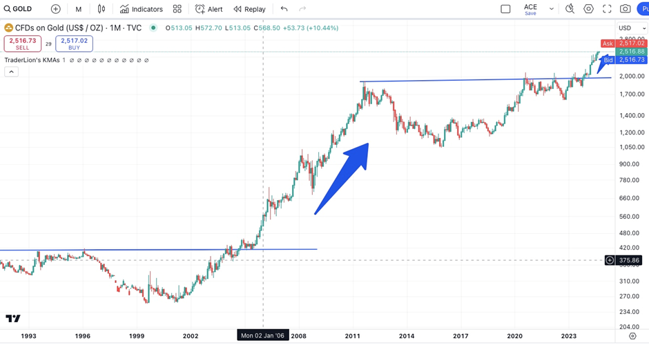 Analysis- Gold (in US $ terms) seems to be repeating the cycle of 1990-2003. It recently broke out from a long period of consolidation between 2011-2023 and has trended upward ever since.