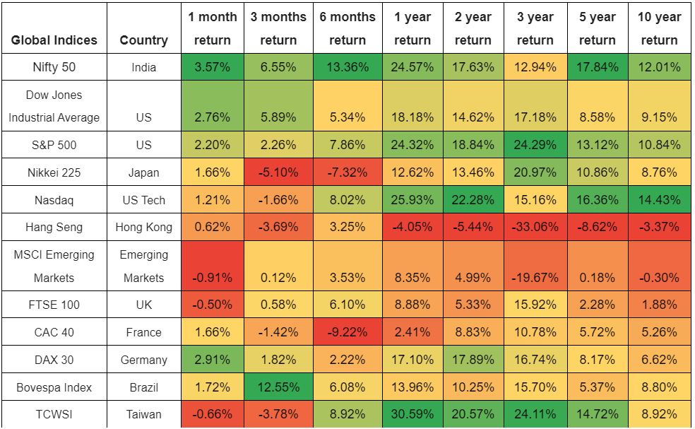Analysis- In the short term the Nifty 50 is the best performing global equity index. In the medium term, the US, Japan, UK & Taiwan are in contention. In the long term, only NASDAQ had performed better (in the small but broad sample space considered).