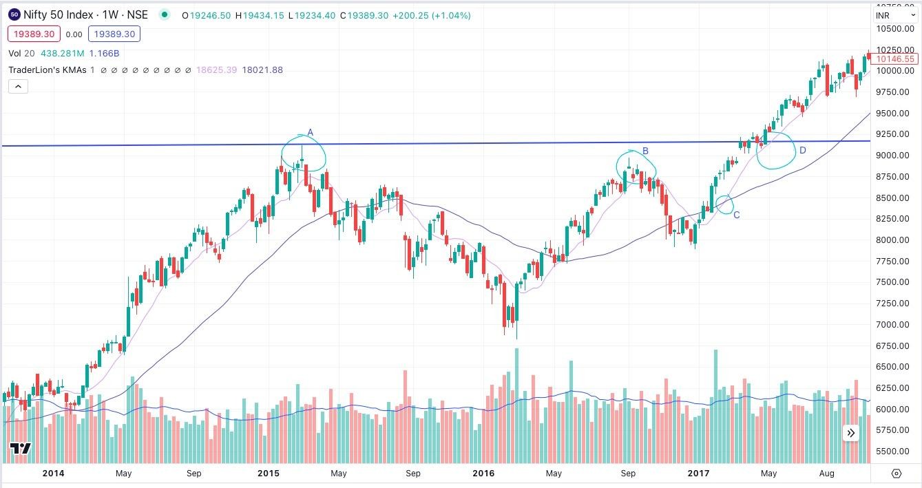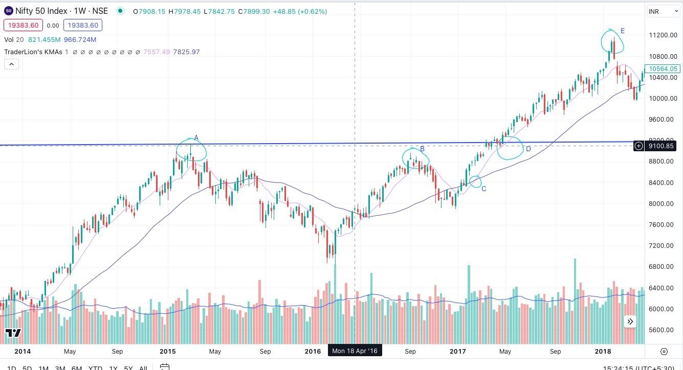 When the Nifty crosses a multi-year ATH decisively, it is followed by a strong up-move. The current move looks very similar to previous moves. Since the PE ratio is on the higher side (relative to history) this move should be closer to the 2013-17 move with an expected upside above 20% at the end of the rally. That should bring us closer to 22k on the Nifty.