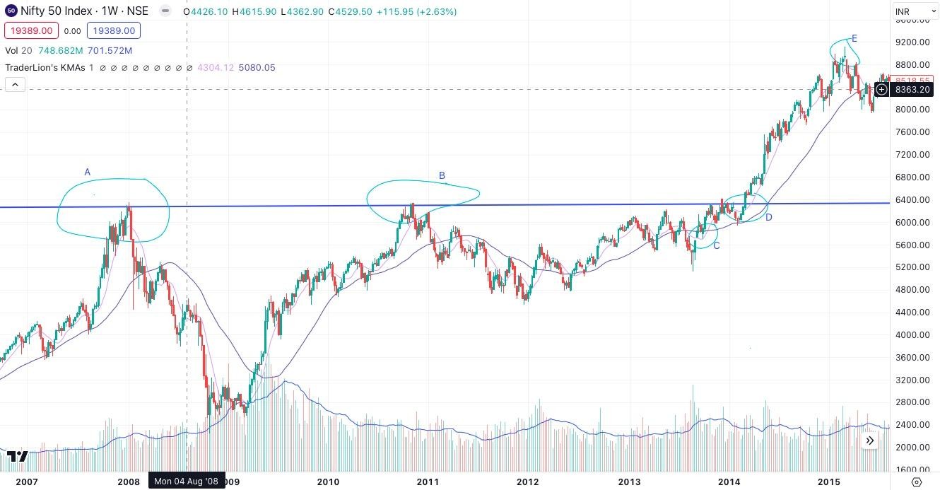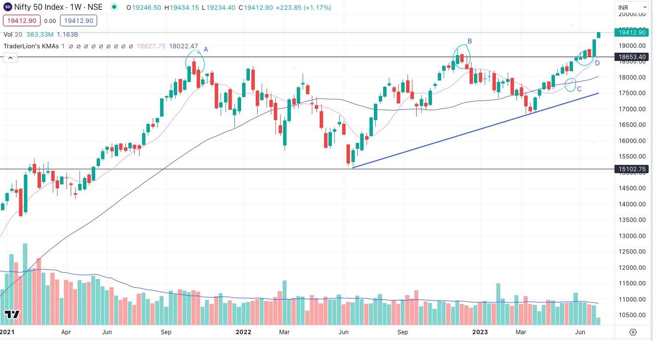 The markets had reached an All Time High (ATH) in Oct 21 with the Nifty at 18,604 (Point A in graph). It then corrected from there to about 15,200 on the Nifty by June 22 before swinging back up in Nov- Dec 22 (point B) and testing the previous ATH. There was a minor correction from there on till about March 23 with the markets now crossing those ATH’s (point D).