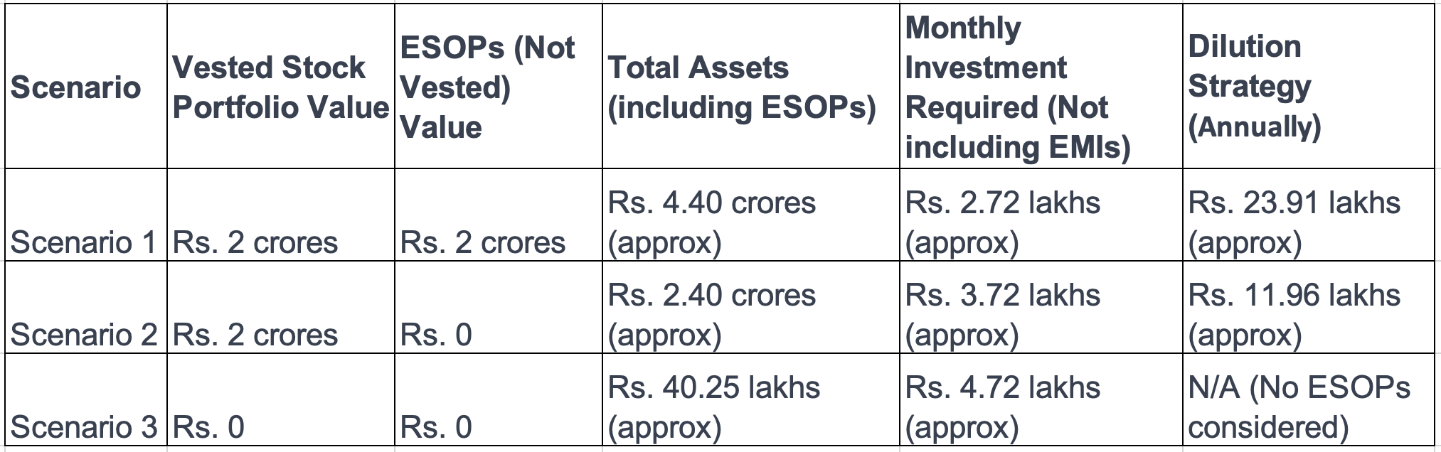 Scenario 3 is the most conservative approach, where Karthik's total assets, including ESOPs, amount to 0.40 crores. In this case, his monthly investment requirement is 4.72 lakhs. However, due to the absence of ESOPs and low total assets, there's no dilution strategy required here.