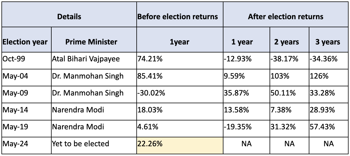Below table shows the pre and post NIFTY 50 returns for periods during the past 5 elections: