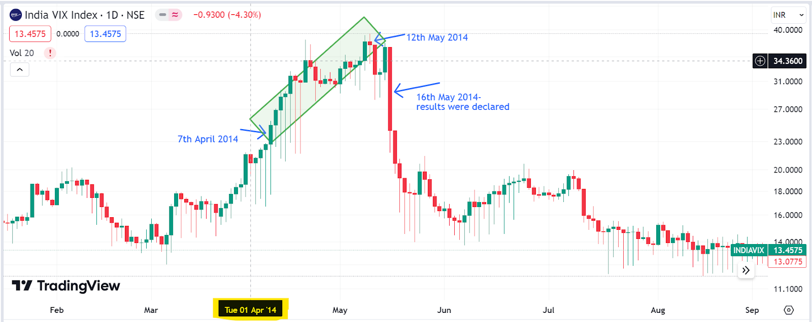 We see that volatility index started moving up around the end of March 2014 and kept the pace up until the last day of the elections (12th May 2014). On the last day of elections, it reached peak of around 39 (during that time period). After that we notice a sudden drop in the volatility index on the day of the announcement of results (that is 16 May 2014- highlighted in the graph above). Later it moved down to 13 at the end of July 2014.