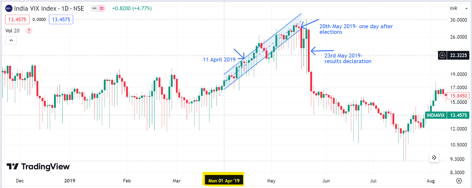 Post which, on the day of results declaration, Vix experienced a drop(as seen in 2014 elections as well), eventually reaching the range of 13-15 at the end of July 2019.