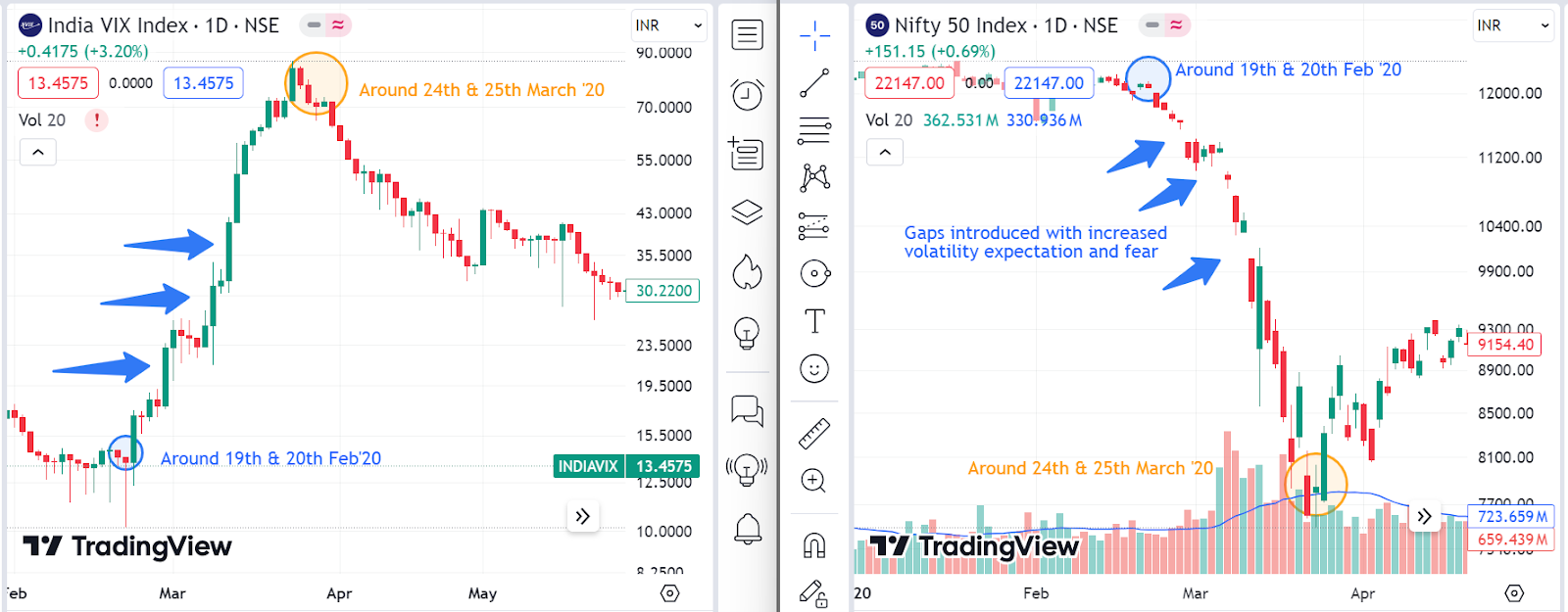 With each new green candle on the Vix graph, there was a gap introduced in the Nifty graph. Nifty started dropping faster indicating a bearish trend with increased volumes and larger moves in the prices (refer to the larger candles on the right graph).