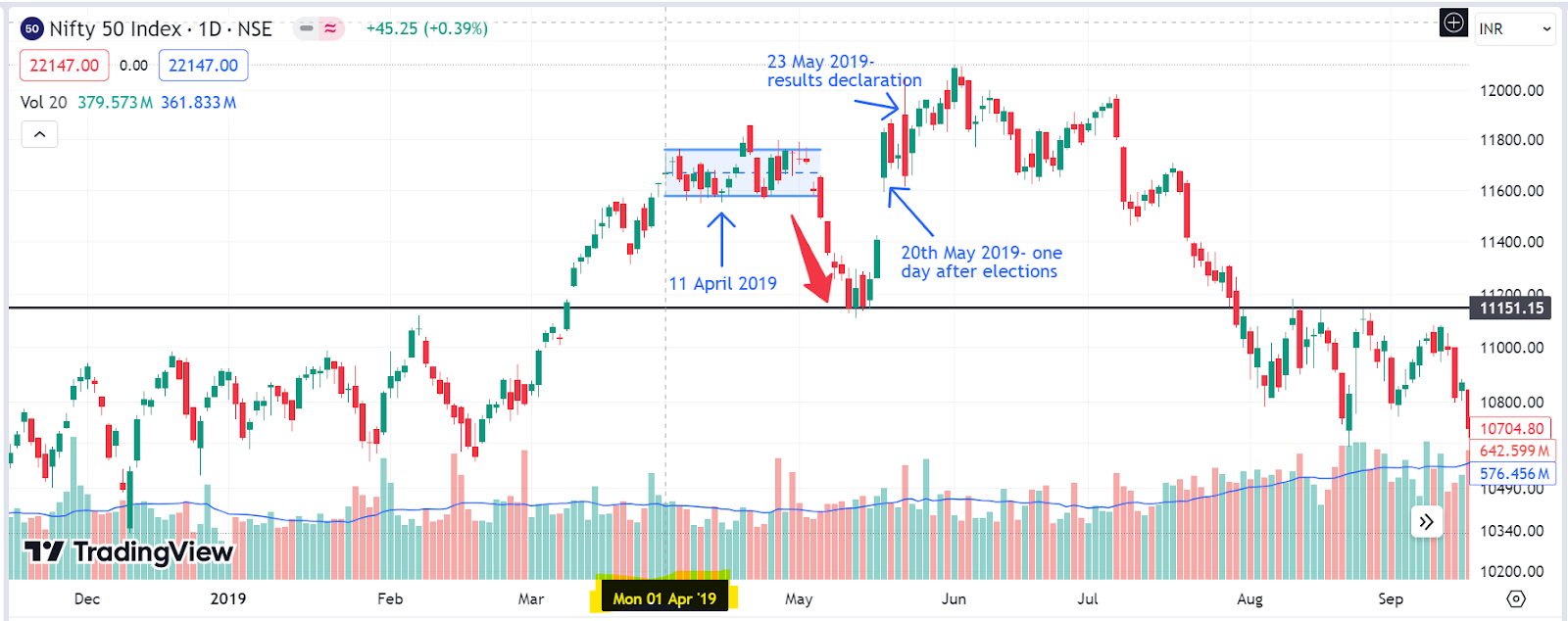 Nifty experienced sideways movement at the beginning of April 2019 (refer to the blue channel highlighted in the chart above) and during the beginning of May ’19, it saw a down move with reasonable volumes, finding support at around 11150 (coming down from around 11800).