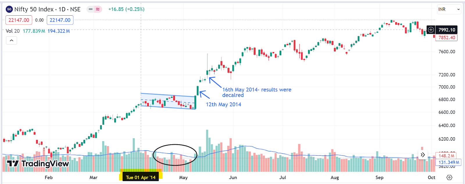 Nifty started moving sideways at the beginning of April 2014, making a slightly downward trend (highlighted within the blue channel in the graph above) by the end of the 2014 elections. We also notice a volume contraction during this period (refer to the circle highlighted in the graph).