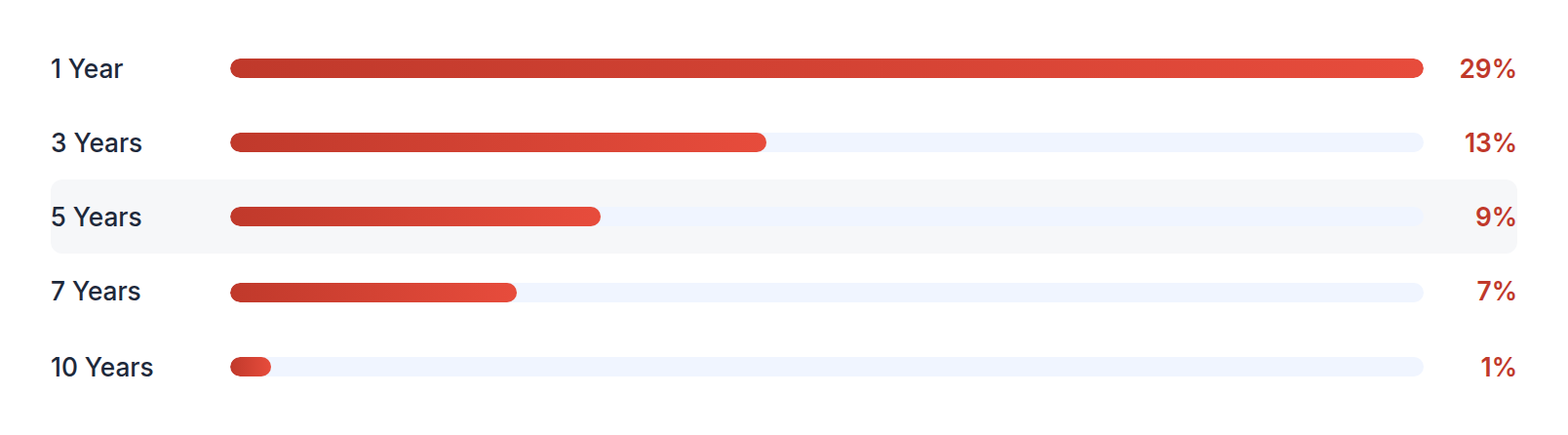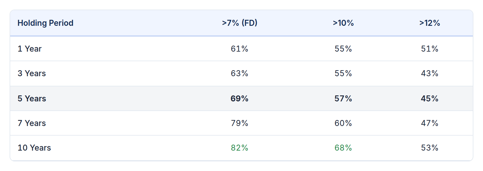 Percentage of rolling windows exceeding each CAGR threshold, by holding period: