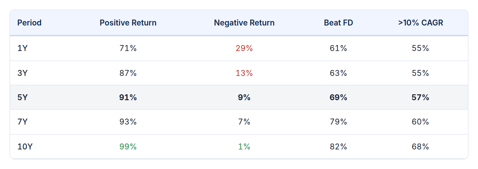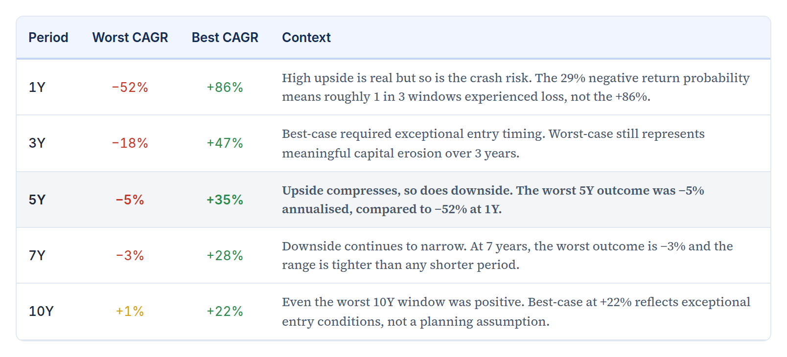 Negative return probability falls consistently with holding period. Markets move in cycles; short windows often capture only part of one — a crash without the recovery, or a rally without the correction. Longer periods allow the cycle to complete. Time does not eliminate risk, it reduces the chance of being caught mid-cycle.